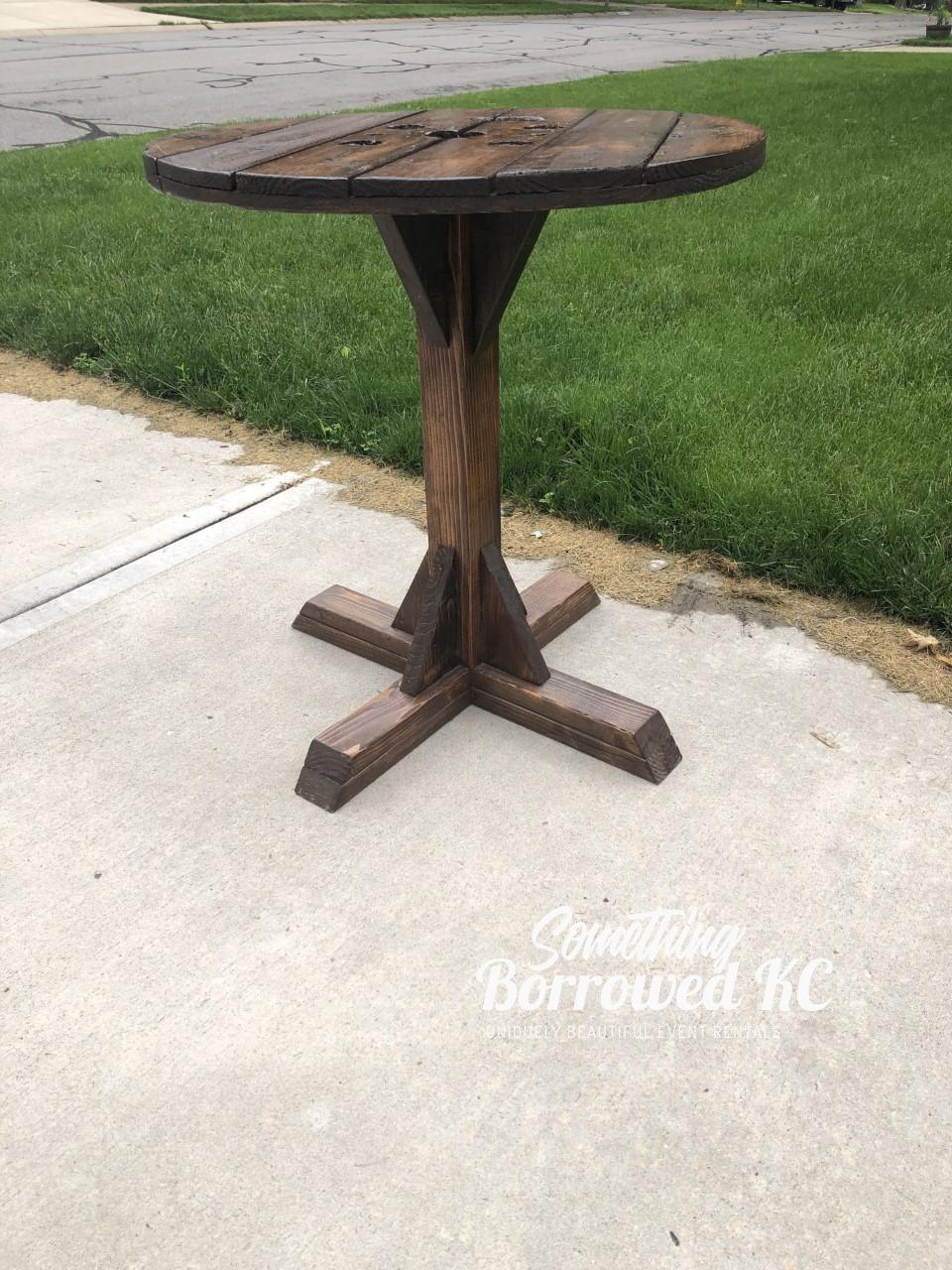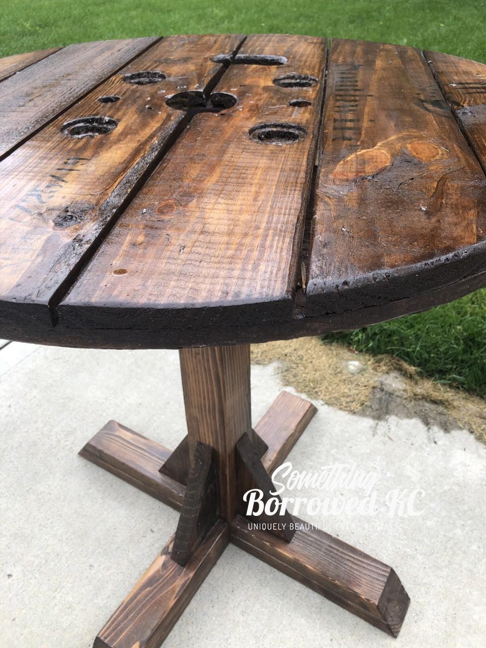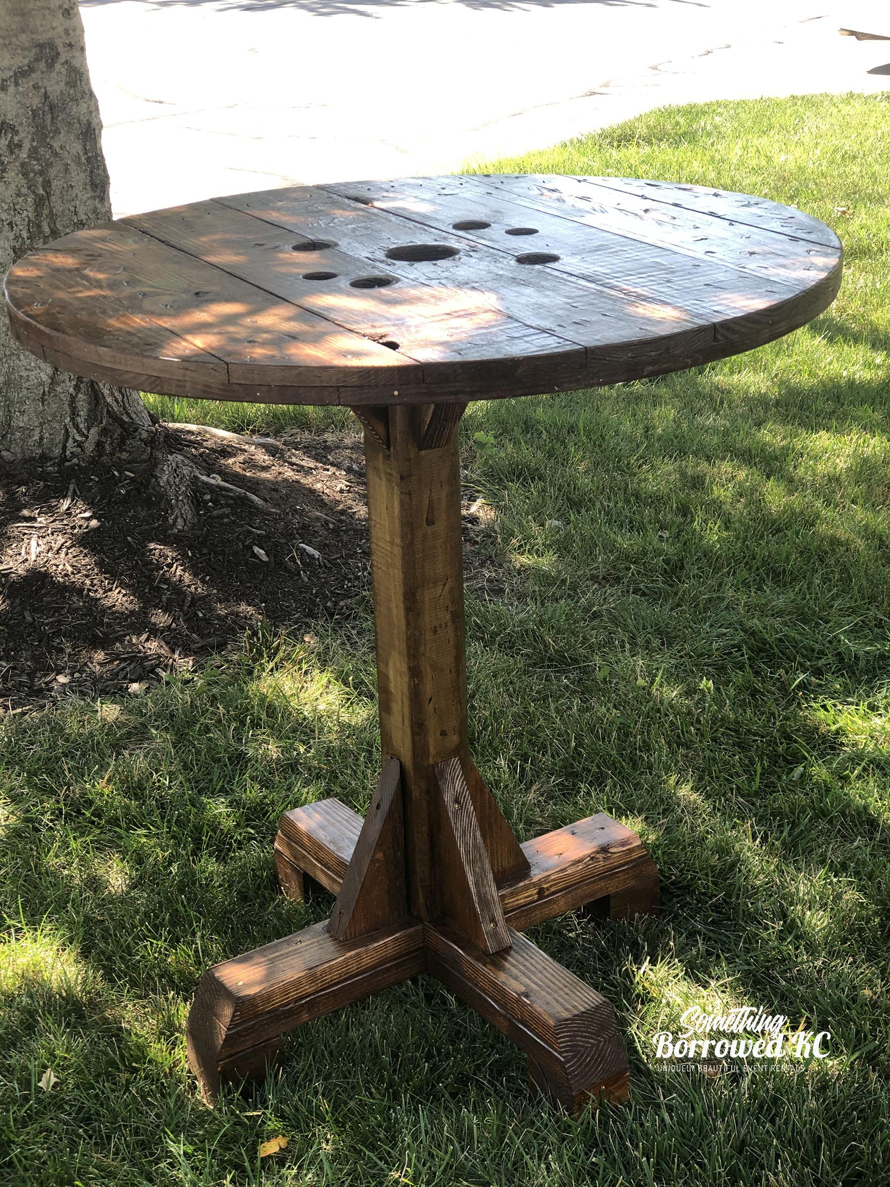 Known lovingly as our Giraffes, our high top tables are perfect for food display or as a gathering spot for guests to rest their glasses. Made from upcycled spools, the holes on top add rustic charm.