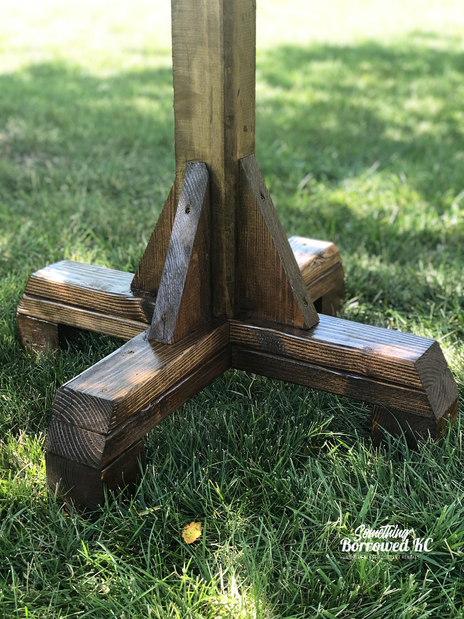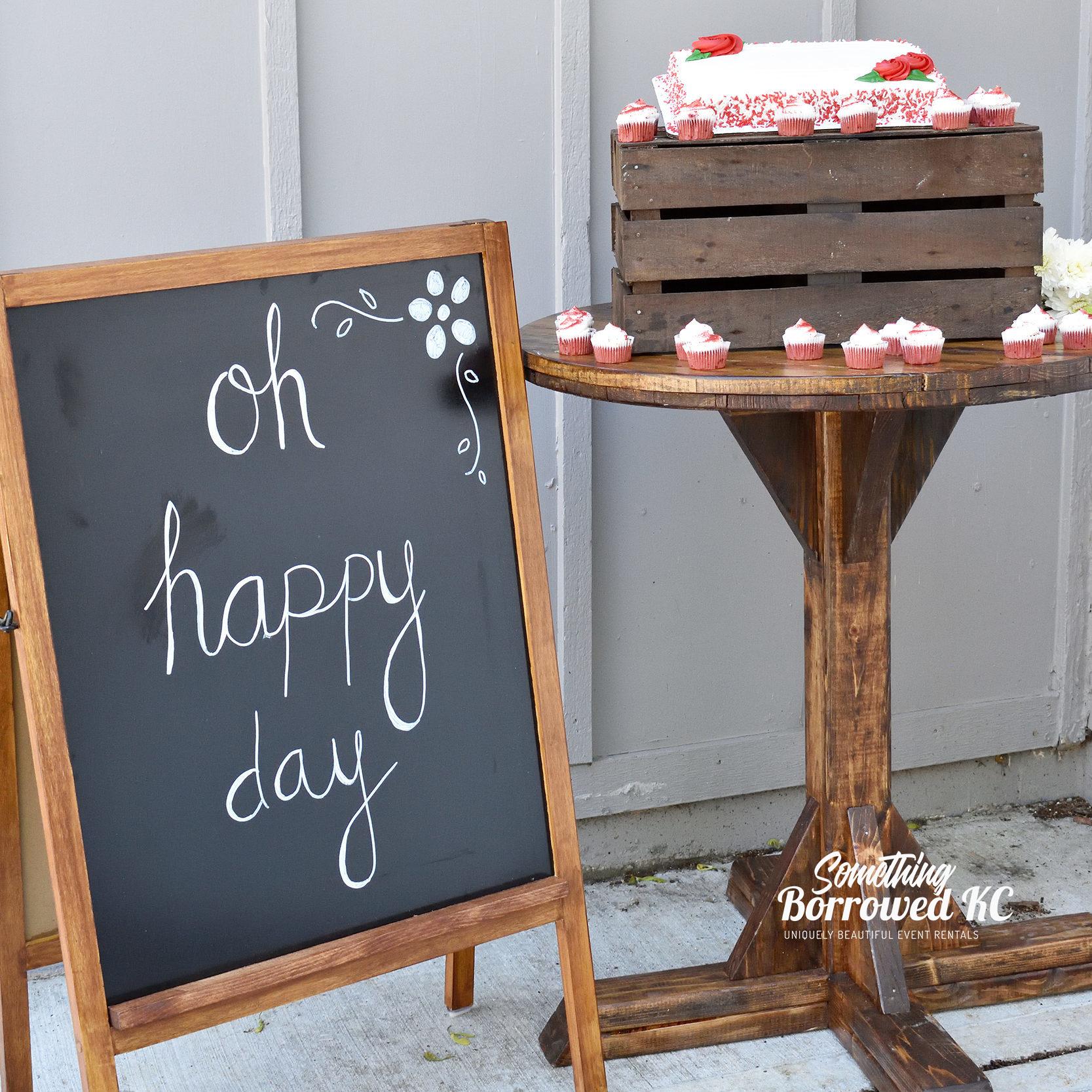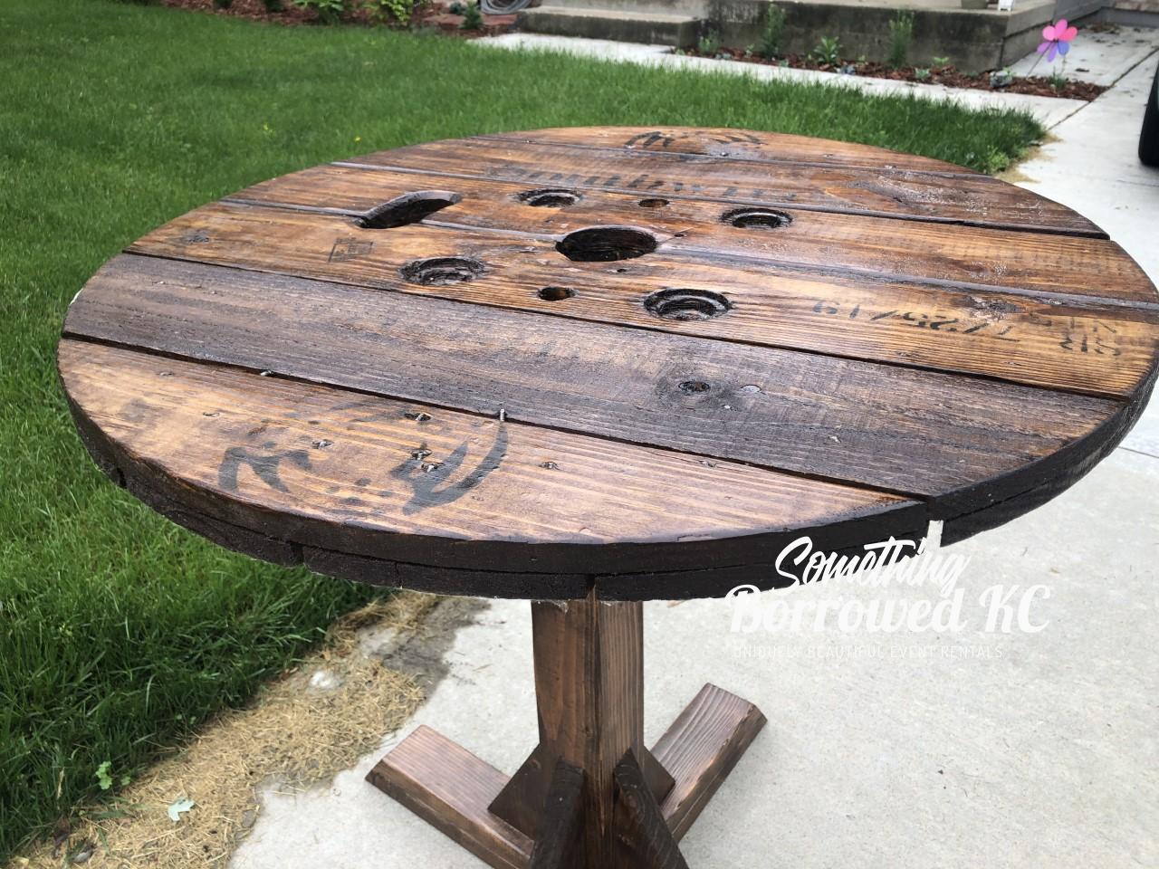 Known lovingly as our Giraffes, our high top tables are perfect for food display or as a gathering spot for guests to rest their glasses. Made from upcycled spools, the holes on top add rustic charm.