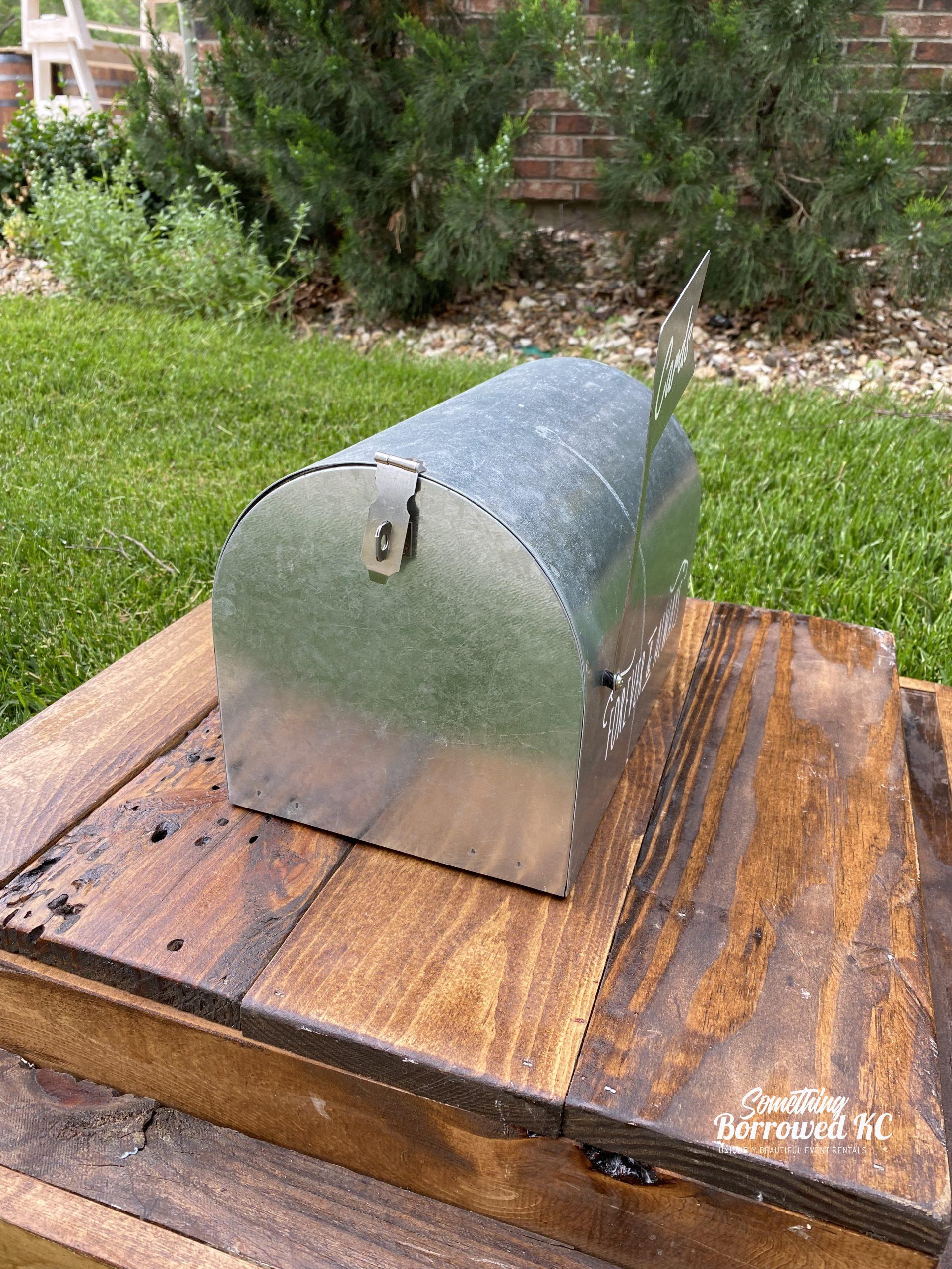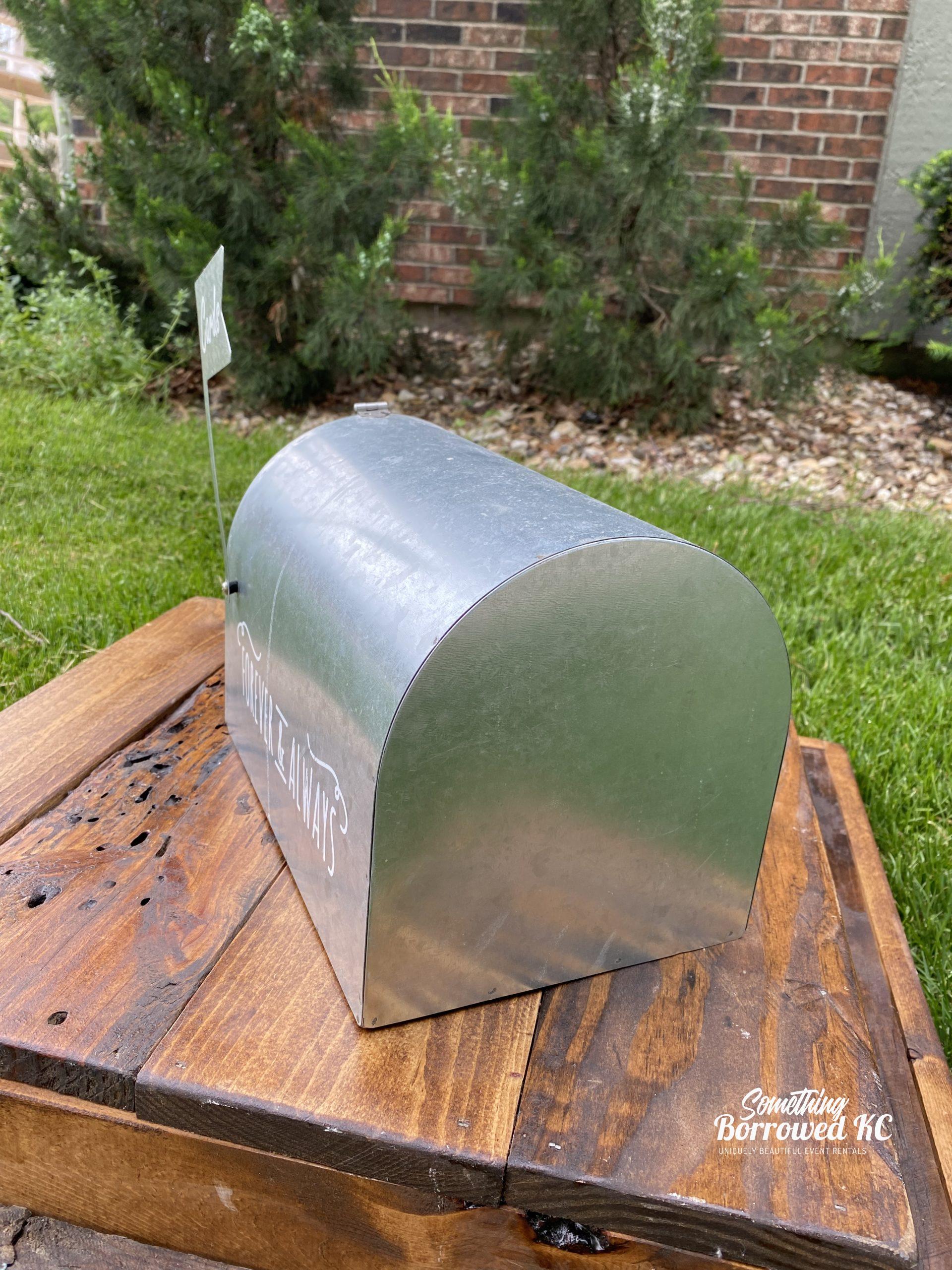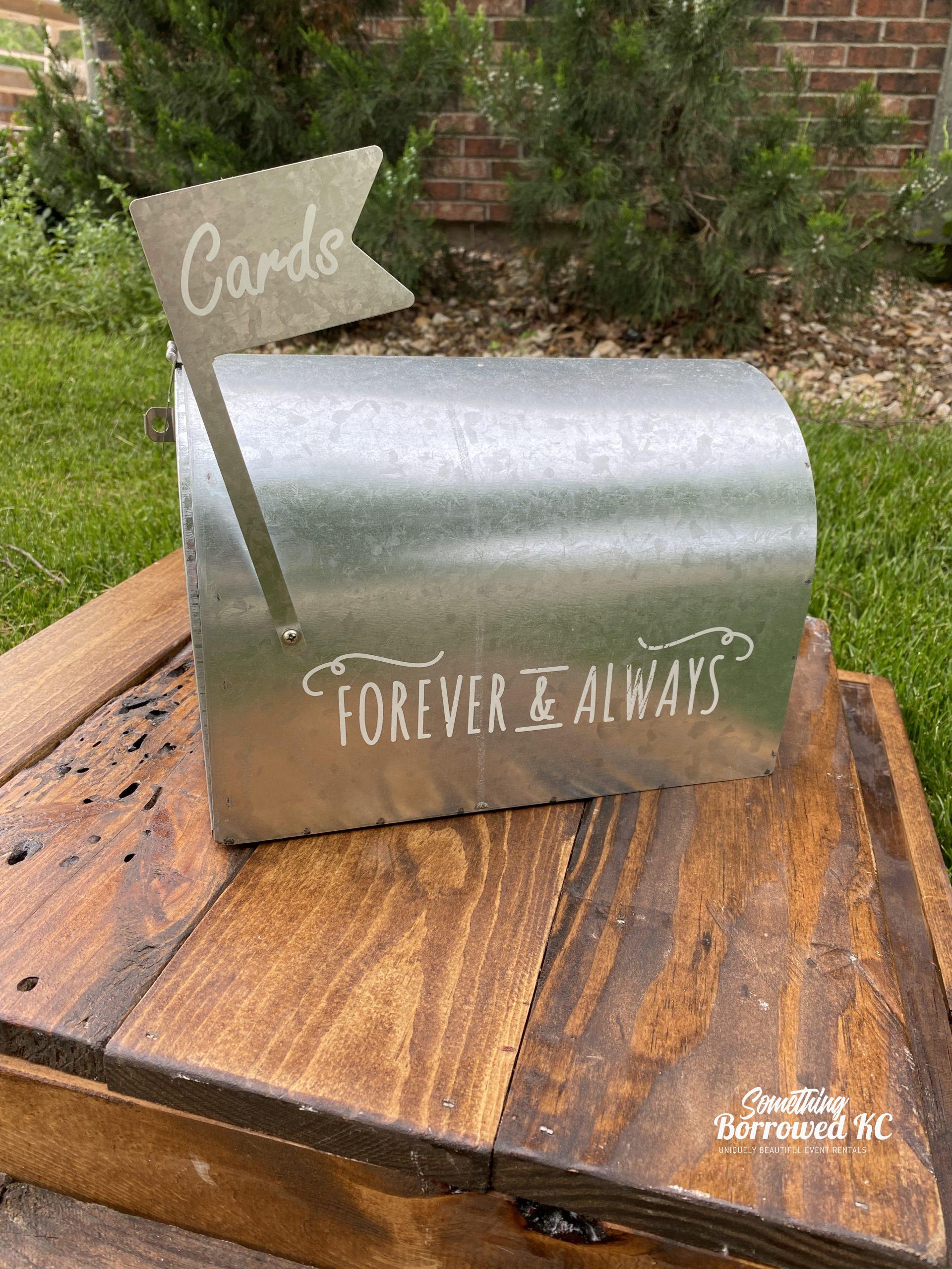 Full of character galvanized metal mailbox says Forever and Always on one side. The flag can go up and says “cards”