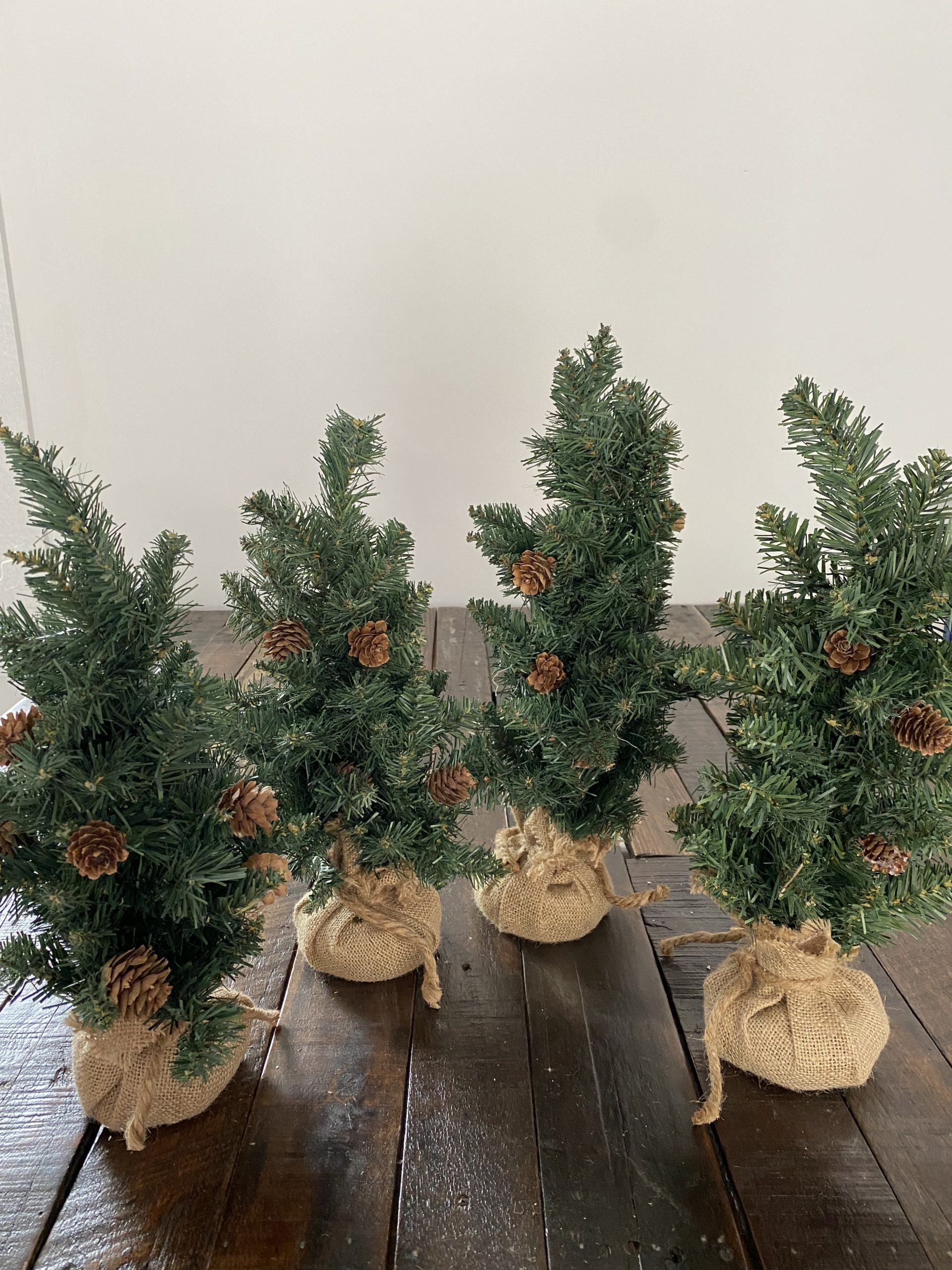 Table Top Forest Green Pine Trees With Pine Cones with base wrapped in burlap.