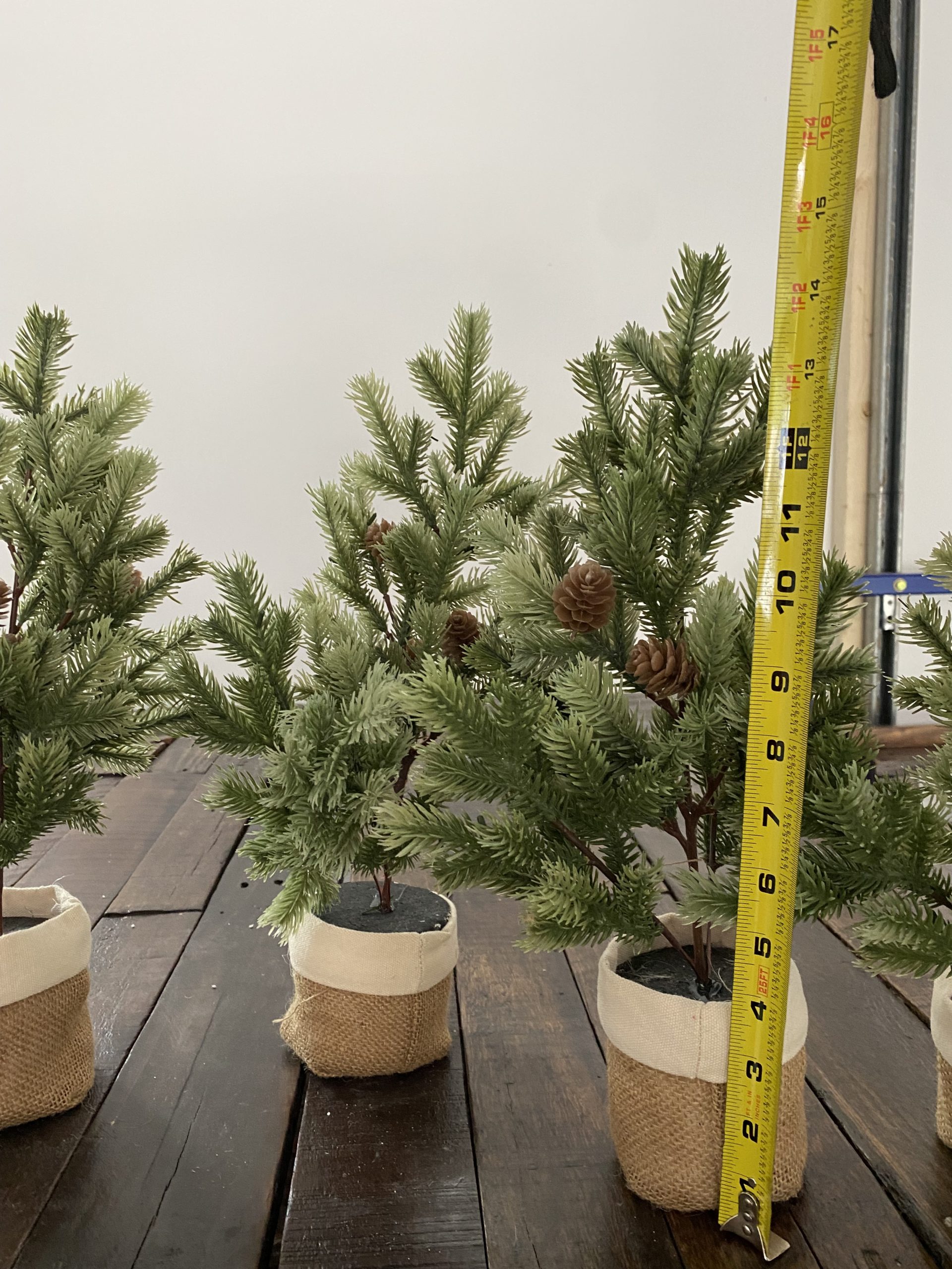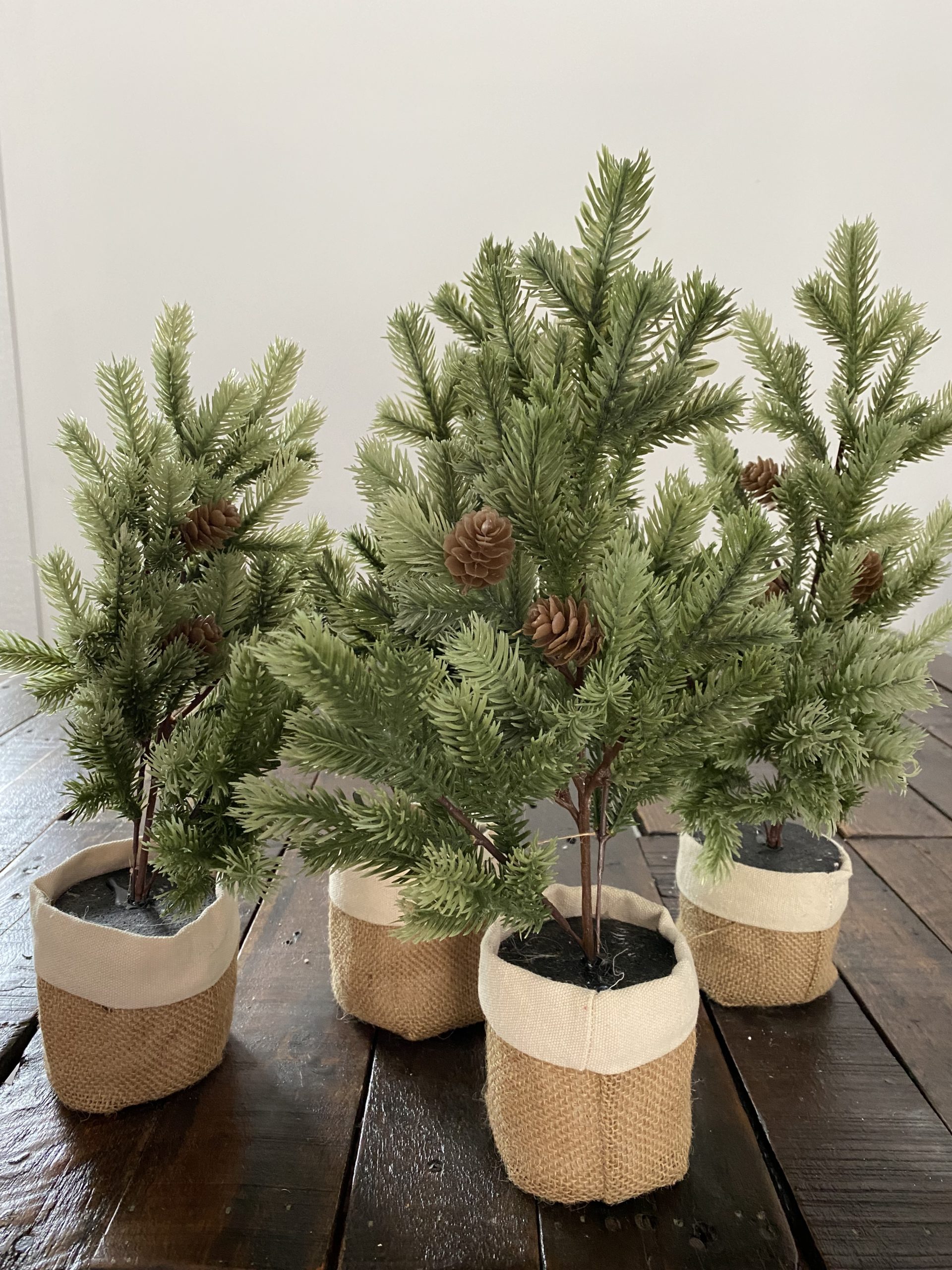 Table Top Light Green Pine Trees With Pine Cones with base wrapped in burlap.